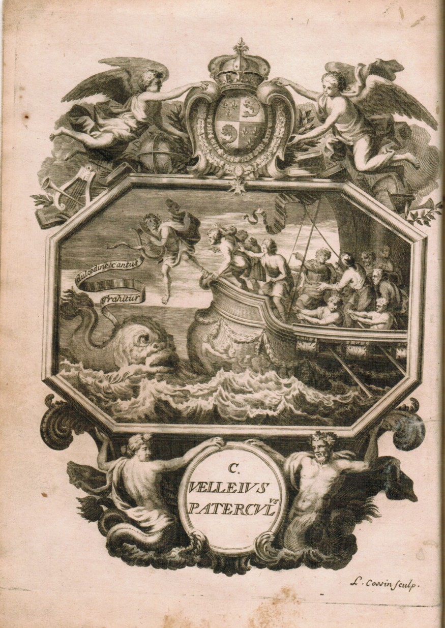 Velleius C. Paterculus. Historiae Romanae. Ad M. Vinicium Co(n)s(ulem). Libri duo. Interpretatione et notis illustravit Robertus Riguez. In usum serenissimi Delphini. Mit 1 Frontispiz nach L. Cossin. Paris, Fredericum Leonard 1675. Gr.-8°. Frontispiz, Titel,12 Bll., 151(1) S. u. 41 Bll. (Index vocabulorum omnium quae in Velleio Paterculo leguntur). Neueres genarbtes grünes Ldr. über 5 Bünden m. Ldr.-RSch (minimal berieben u. bestoßen, lichtrandig u. Rücken ausgeblichen). Schweiger II, 1128. – Velleius Paterculus (ca. 20 v. Chr. bis 30 nach Chr.) war ein römischer Historiker. Er schrieb ein Kompendium der römischen Geschichte, das die Zeit vom Ende des Trojanischen Kriegs bis zum Tod der Livia im Jahr 29 behandelt. Velleius Paterculus war im Altertum wenig bekannt. Er scheint von Lucan gelesen und von Sulpicius Severus nachgeahmt worden zu sein. Der Text blieb nur in einem einzigen, schlecht geschriebenen und verstümmelten Manuskript erhalten, welches Beatus Rhenanus 1515 in der Abtei von Murbach im Elsass entdeckte und das heute als verloren gilt. – Papierbedingt minimal gebräunt u. minimal fleckig, Titelei leicht angestaubt.