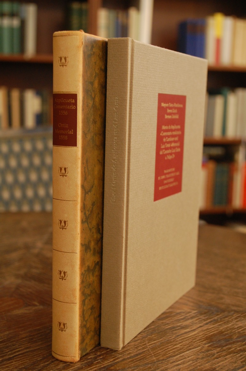 Ökonomie – Azpilcueta, Martin de und Luis Ortiz. Comentario resolutorio de Cambios, sobre el principio des capitulo final de usuris. Und: Memorial del Contador Luis Ortiz a Felipe II. (= Handschrift). 2 Bde.(in 1). Facsimile mit Kommentar-Bd. 2 Bde. Düsseldorf, Wirtschaft u. Finanzen 1998. 1 w. Bl., S. 47-104 S. + Bl. 4-74 u. 200 S. (= Vademecum). OLdr. m. verg. R.-Titel u. R.-Fileten. OPpbd. m. vergold. R.-Titel u. DSch. (= Vademecum). (leicht lichtrandig u. Rücken ausgeblichen, Ppbd.: Hinterdeckel fingerfleckig). „Klassiker der Nationalökonomie“. Nr. 32 v. 400 Exemplaren des Faksimiles der Ausgabe Salmanca u. Madrid, 1556 u. 1558. – Hier der wichtige Anhang von Martin de Azpilcueta (1492-1586) aus ‚Comentario resolutorio de usuras‘, aus dem der für die Entwicklung der Geldmengentheorie wichtige Anhang wiedergegeben wird. Luis Ortiz hatte 1543 das Amt eines stellvertretenden Contador in der Finanzverwaltung von Malaga inne und legte diese Denkschrift ‚Memorial‘ 1558 König Philipp I. vor, dessen Anregungen und Forderungen ihn als einen der frühesten Merkantilisten ausweisen. – Das Vademecum mit Beiträgen v. Marjorie Grice-Hutchinson, Ernest Lluch u. Bertram Schefold.