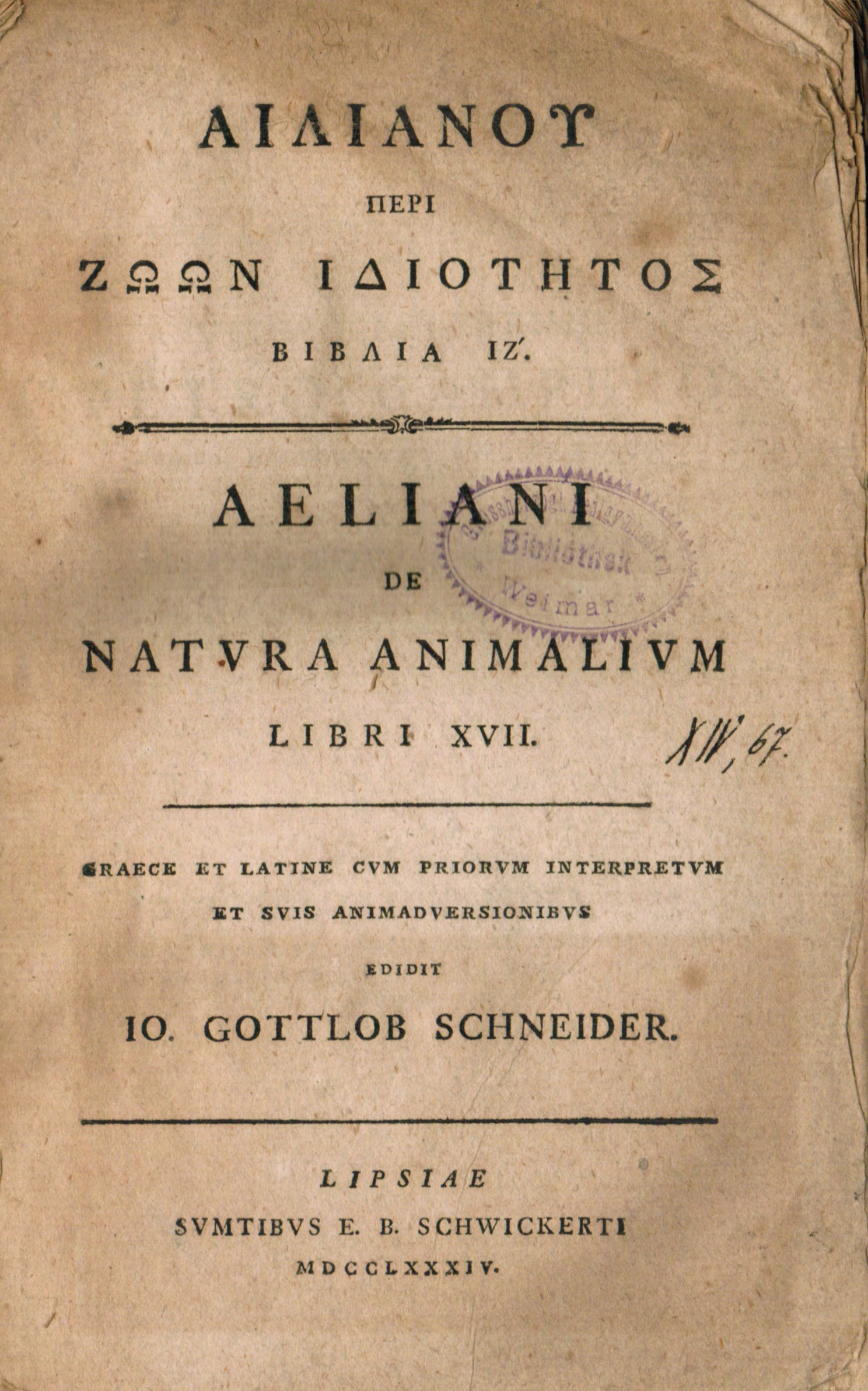 Aelianus, (Claudius). PERI ZOON IDIOTETOS. De natura animalium libri XVII. Graece et latina cum priorum interpretum et suis animadversionibus ed. Io. Gottlob Schneider. 2 Theile in 1 Bd. Leipzig, E.B. Schwickerti 1784. X(2), 585(19 S. = Index) S. (graece mit lat. Anmerkungen) u. 228(42 S. – Index) S. (lat.) – meist unbeschnitten. Interims-Brosch. (berieben, bestoßen, mit Randläsuren u. Rücken mit Fehlstellen). Schweiger I, 3. Hoffmann I, 15. Lübker 16. – Aelian lebte unter Hadrian in Rom als Lehrer der Beredsamkeit. Hier vorliegend ist sein recht seltenes Gesamtwerk, wobei seine Tiergeschichten offenbar einen großen Leserkreis gehabt haben müssen. – Papierbedingt Titelei u. letztes Bl. leicht, sonst nur minimal gebräunt, minimal angestaubt, Titel mit Bibl.-Stempel u. handschriftl. Bibl.-Signatur, Exlibris verso Deckel. – Seltene 2-sprachige Ausgabe.