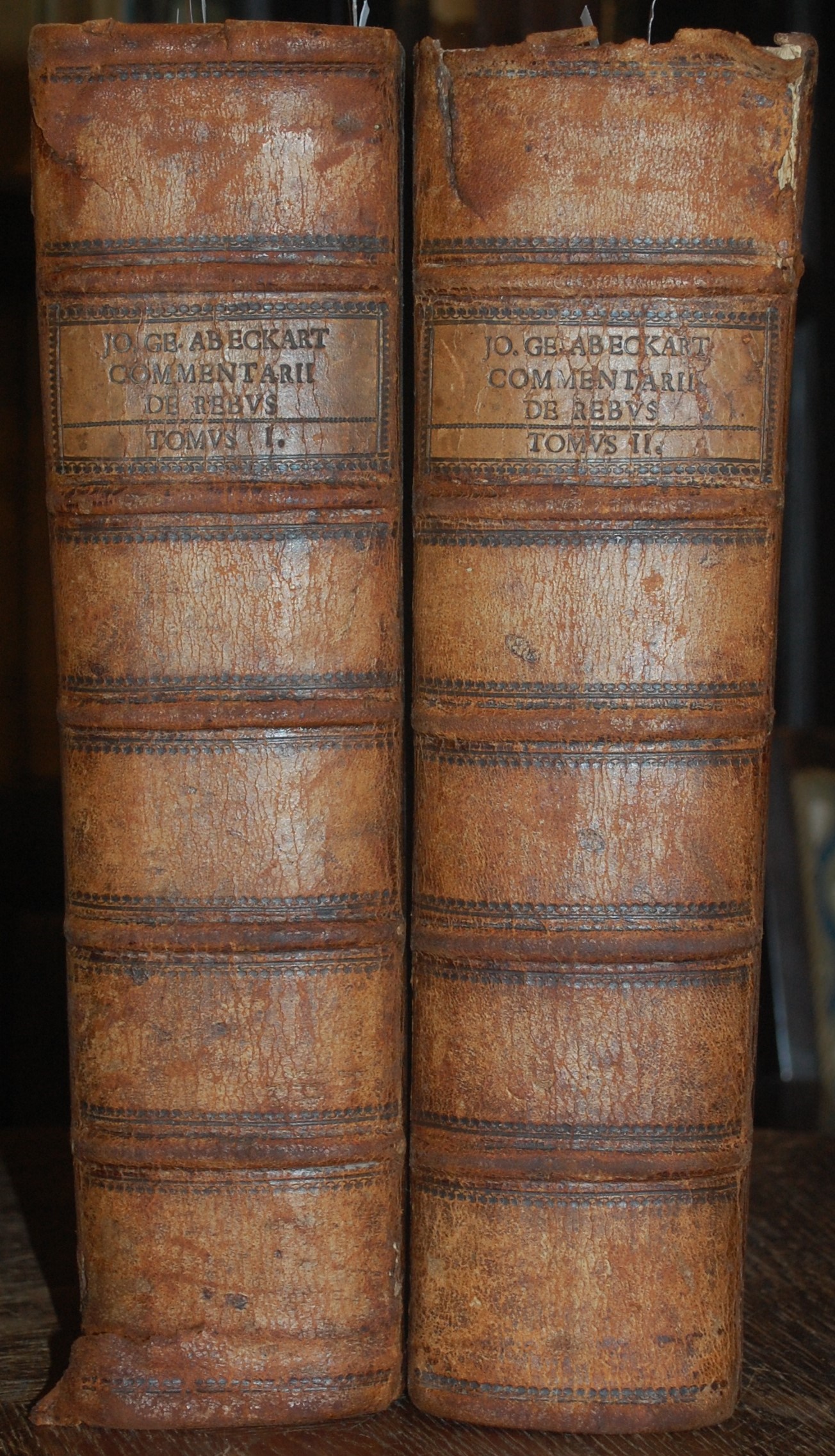 Eckhart, Johann Georg v. Commentarii de rebus Franciae orientalis et Episcopatus Wirceburgensis. Mit 2 gest. Titelvign., 1 gest. Porträt-Tafel, 7 gef. Kupfertafeln und 67 Textkupfern sowie einer Stammtafel. 2 Bde. Würzburg, gedruckt bei H. Engmann 1729. Folio. 13 Bll., 936 S. u. 32 Bll. (Index) u. 2 Bll., 1004 S., 39 Bll. (Index). Ldr. d. Zt. (leicht berieben, bestoßen, fleckig u. mit zarten Abschabungen, Kapitale u. Außengelenke mit teils fachgerecht geklebten Einrissen an den Kapitalen). Pfeiffer 15272 bzw. 47775. Graesse II, 459. Wegele 687ff. – Einzige Ausgabe. „Dieses gehört sachlich ebensogut der deutschen als der Geschichte des Hochstiffts Würzburg an. Es hat für die letztere eine grundlegende Bedeutung, darf aber, was die erstere anlangt, den Leistungen von Leibnitz, Mascov und Bünau unbedenklich an die Seite, zum Teil über sie gestellt werden“ (Wegele). Die Kupfer mit Inschriften, Urkundenfaks., Münzen etc. – Papierbedingt nur teils im Satzspiegel leicht gebräunt u. teils minimal stockfleckig, mit sehr vereinzelten, sehr zarten kl. Bleistift-Anmerkungen, Vorsätze mit kl. Initialen-Stempel, minimal angestaubt u. minimal fleckig, Innengelenke teils leicht angeplatzt, verso Titel-Bll. Bibl.-Stempel (Würzburg) u. „ausgeschieden“-Stempel