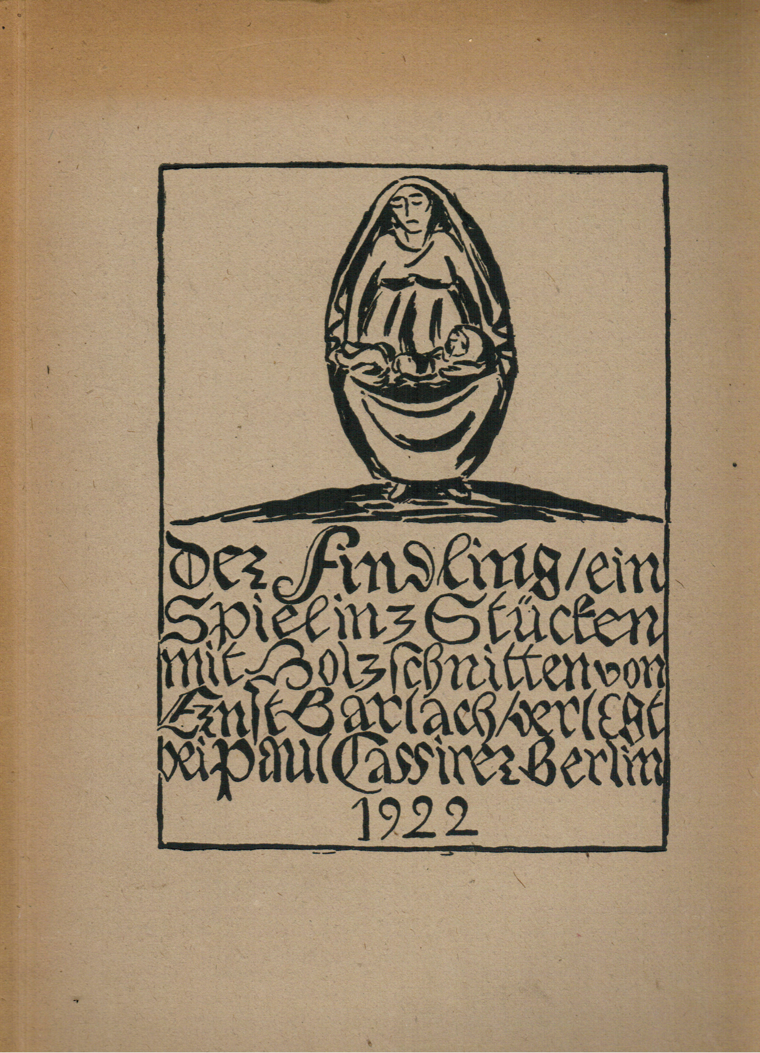 Barlach, Ernst. Der Findling / ein Spiel in 3 Stücken mit (20) Holzschnitten. Berlin, Cassirer 1922. 4°. 77(3) S. OPpbd. (mit minimalen Randläsuren, leicht lichtrandig, Rücken gebräunt, ob. Kapital mit minimalen Einriß u. Kapitale mit Fehlstellen im Bezugspapier). Erste Ausgabe. Wilp./G. 4. Raabe 15, 4. – Papierbedingt etwas gebräunt.