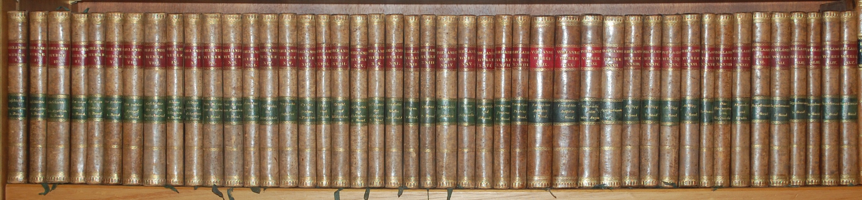 Wieland, C(hristoph). M(artin). Sämmtliche Werke. 45 Bde. Carlsruhe, Bureau der deutschen Classiker 1814-18. OHLdr. m. je 2 verg. RSch. u. R.-Fileten (nur minimal berieben u. bestoßen). Goed. IV 1, 573, 190y. – Sammlung der vorzüglichsten deutschen classischen Schriftsteller und Dichter. – Bd. XL – XLV sind die Supplement-Bde. 1-6. – Nur sehr wenige Bde. teils ganz minimal stockfleckig, wenige Lagen in 2 Bdn. mit schwachem Überdruck einer anderen Lage. – Sehr dekorative Reihe.