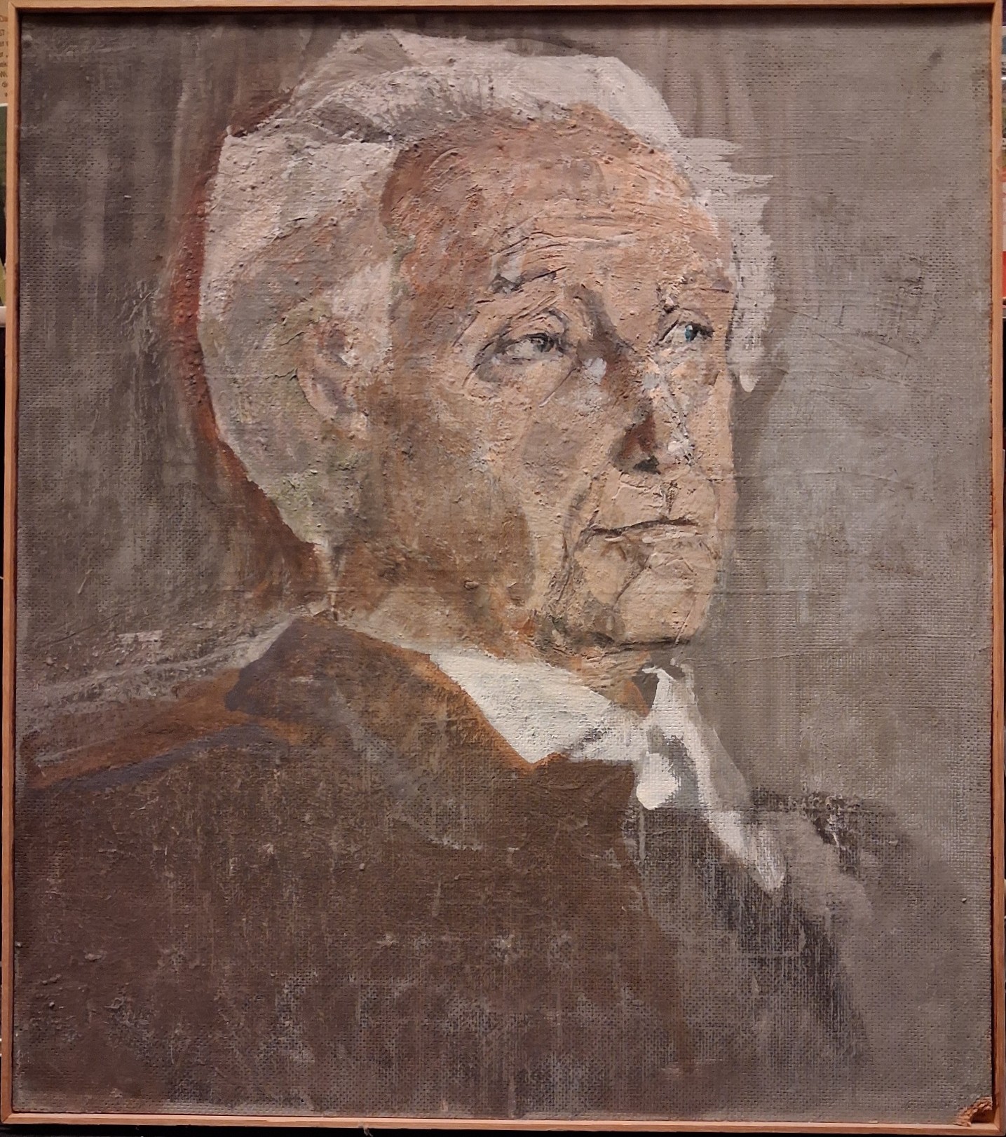 Martinotto (i.e. Fritz Kotzenberg). Porträt in Öl auf Pressspan von Hans Böglin (i.e. Willy Hellemann, alias Hamlet). Tessin um 1955. 43,5 x 50 cm. Mit schmalem (3 mm)-Holzrahmen. Der Maler Fritz Kotzenberg (1909 – 1973), studierte zunächst 1928/29 bei Friedrich Gundolf und Ernst Curtius in Heidelberg, dann aber von 1933-37 an der Düsseldorfer Kunstakademie. Seit 1953 lebte er wieder als Künstler in Heidelberg, besaß aber im Valle Onsernone eine Bergalm mit Atelier, die er vor allem im Sommer aufsuchte. Auch der Dichter Willy Hellemann lebte mehrere Wochen und Monate im Jahr zunächst in Berzona (Seghelina), später in Mosogno. Beide gehörten auf unterschiedliche Weise einem Nachfolgekreis um Stefan George an und besuchten sich dort häufig bzw. trafen sich mit Freunden aus dem Kreis. Das Bild wurde zunächst von Heinz Kuby erworben, gelangte später in den Besitz von Renate und Wolfgang Osthoff. – Rechts unten ein kleiner Ausbruch aus der Platte (2x2 cm). Sonst wohlerhalten.