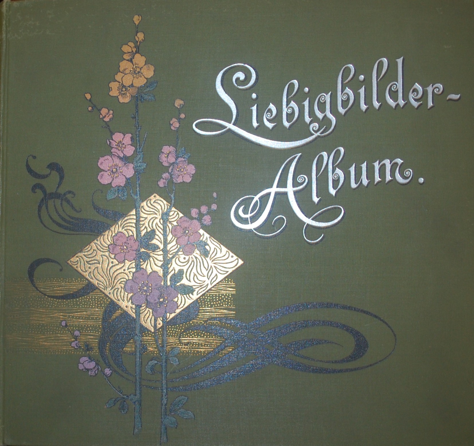Liebigbilder-Album. 74 vollst. Serien à 6 Bildern der Fa. Liebig. (zus. 444 Bilder). Ohne Ort, meist nach 1905. Quer-4°. (30 x 28 cm). 40 Bll. (davon 37 beidseitig besteckt). OLn. m. versilbertem Schriftzug u. farb. verg. Deckel-Illustr. (Stockrosen). (leicht berieben, bestoßen). Enthält u.a. die Serien: Principesse celebri. Franz. Provinzen. Gasthäuser. Ital. Renaissance. Schmetterlingsjagd. Korea. Hühner. Musikinstrumente. Nationalhymnen. Die fünf Sinne. Alpen-Blumen. Der Handschuh. Grosse Eroberer. Parsifal. Lebensalter. Truppengattungen. Schmetterlinge. Der Edelstein. Enten. Frauenorden. Mühlen. Marokko. Elfenspiele. Europ. Wasserstrassen. Farben. Astronomen. Gartenanlagen. Raubvögel. Karneval. Leuchttürme. Zünfte. Seide. Blumenfeste. Fortschritte in der Luftschiffahrt. – Papierbedingt am Rand minimal gebräunt, etwa 8 Serien (ca. 18 Bilder) mit sehr geringen Verklebungen, sonst Einsteckbilder in sehr gutem Zustand u. kräftiger, frischer Farbe.