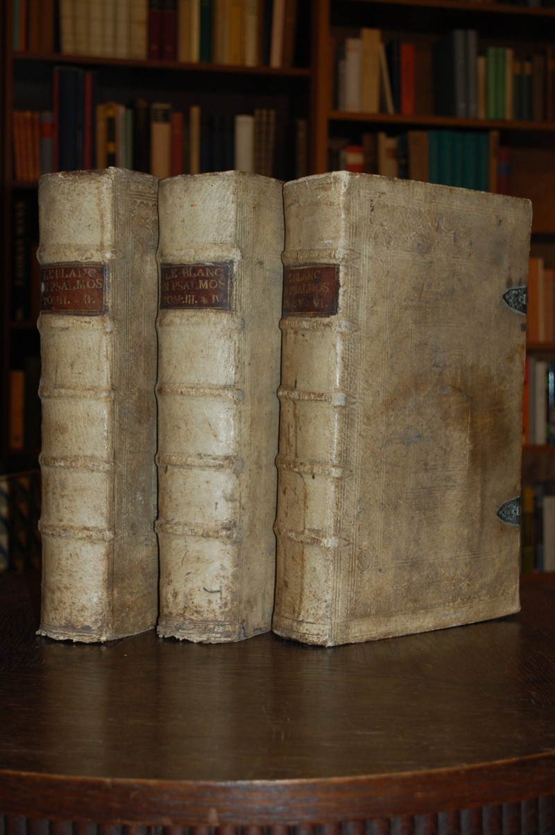 Le Blanc, Thomas. Psalmorum Davidicorum Analysis In Qua Aperte Cernitur Singulis in Psalmis ordinem esse admirabilem: Adjungitur Commentarius Amplissimus, In Quo Non tantum sensus Litterales; sed omnes etiam Mystici exponuntur (…). 6 in 3 Bdn. Köln, Peter Pütz & Erben, Unter fetten Hennen im Rosenkranz 1744. Folio. 23 nn. Bll., 1234 Sp., 11 nn. S.; 6 nn. Bll., 1200 Sp., 13 nn. S. und: 7 nn. Bll., 1138 Sp., 5 nn. S.; 4 nn. Bll., 1326 Sp., 10 nn. S. und: 4 nn. Bll., 1114 Sp., 7 nn. S. 4 nn. Bll., 1302 Sp., 5 nn. S. Blindgepr. Schweinslederbände über Holzdeckeln mit led. RSch (etwas berieben, Ecken teils abgestoßen, gebräunt, etwas fleckig, teils etwas wurmlöchrig, mit 3 (statt 6) Schließen).
