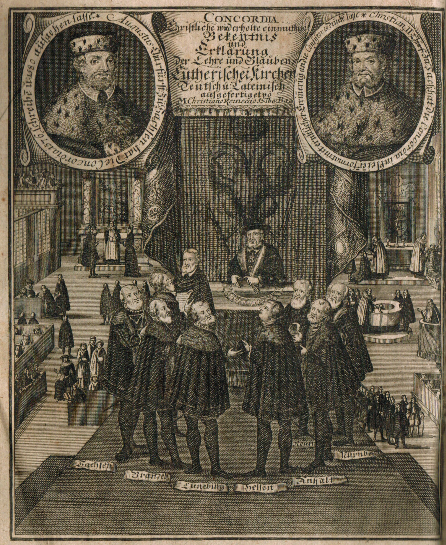 ADB 28, 15f. VD 18 10739440-003. – Christian Reineccius (1668-1752), ab 1721 Rektor des Gymnasiums „illustre Augusteum“ in Weißenfels (heute Goethegymnasium), konzentrierte sich primär auf die sprachliche Bibelforschung. – Titel-Blatt in rot/schwarz Druck. – Frontispiz: Concordia. Christliche wiederholte einmüthige Bekentniß, nachbenannter Chur-Fürsten, Fürsten u. …) – Papierbedingt nur teils leicht gebräunt, nur teils minimal fleckig, nur wenige Seiten mit Tinten-Anstreichungen v. alter Hand.