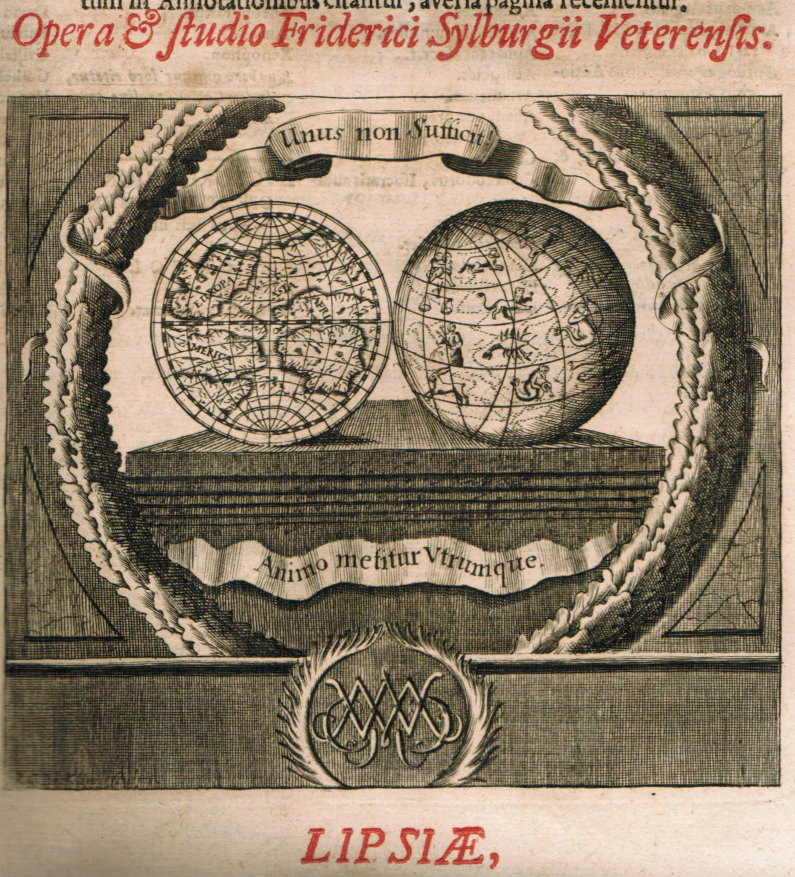 Dionysius Halicarnassus. Scripta, quae extant, omnia, et historica, et rhetorica. E veterum librorum auctoritate, doctorumque hominum animadversionibus, quamplurimis in locis emendata & interpolata; cum Latina versione ad Graeci exemplaris fidem denuo sic collata & conformata, ut plerisque in locis sit plane nova. Addita fragmenta quaedam, cum Glareani Chronologia, & duplici appendice, Additae etiam Notae, quibus de utriusque textus vel emendatione vel explanatione agitur. Adjecti praeterea duo locupletissimi rerum & verborum Indices; alter, Graecus; alter, Latinus. Opera & Studio Friderici Sylburgii Veterensis. 2 Bde. (in 1). Mit 2 großen Titelvignetten (Druckermarken von Weidmann mit Weltkugeln auf einem Podest). Leipzig, Weidmann 1691. Folio. 8 Bll., 792, 168 S., 1 Bl. u. 6 Bll., 280, 94 S. Pergament d. Zt. m. verg. Rückentitel (gering fleckig). Schweiger I, 99. Hoffmann I, 582. Ebert 6222. Nachdruck der Ausgabe von Andreas Wechel (1586). Laut Schweiger ein „unsauberer Nachdruck“ und „nicht correct“. Der Bearbeiter Friedrich Sylburg (1536-1596) war Korrektor bei Wechel in Frankfurt (siehe Pökel 270). – Mit dem gest. Wappen-Exlibris der „Bibliotheca Seckendorfiana“. Eine Lage (4 Bll.) lose, Titelblatt mit geringen Knitterfalten. Schöner 2-spaltiger Druck und schöne griechische Type, gutes Exemplar!