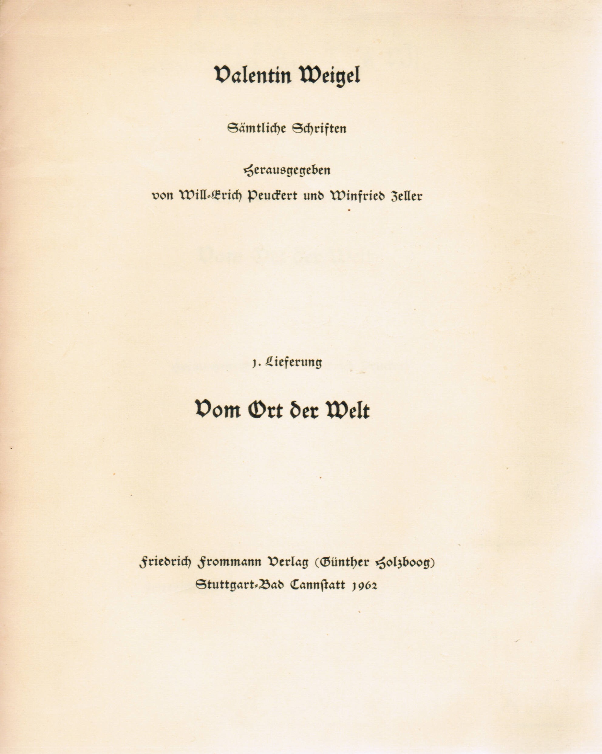 Weigel, Valentin. Sämtliche Schriften. Hrsg. v. Will-Erich Peuckert u. Winfried Zeller. 1.-4. u. 6.-7. Lieferung (ohne die 5. Lief.). Stuttgart-Bad Cannstatt, Frommann 1962-1978. Ca. 1320 S. OBrosch. (minimal berieben u. bestoßen, teils leicht lichtrandig u. Rücken gebräunt). Der luth. Theologe u. Philosoph Valentin Weigel (1533-1588) bewegte sich in den Bahnen des Neuplatonismus. Seine theologischen, naturwissenschaftlichen u. philosophischen Auffassungen stellt er u.a. in seinem Werk ‚Dialogus de Christianismo‘ konzentriert dar. (DBE 10, 387). – 1. Lieferung: Vom Ort der Welt. 2. Lief.: Von der Vergebung der Sünden oder vom Schlüssel der Kirchen. 3. Lief.: Zwei nützliche Tractate, der erste von der Bekehrung des Menschen, der andere von Armut des Geistes oder wahrer Gelassenheit. Kurze Berichte und Anleitung zur Deutschen Theologie. 4. Lief.: Dialogus de Christianismo. 6. u. 7. Lief.. Handschriftliche Predigtensammlung (1573-1574). Mit der 7. Lieferung abgeschlossen. – Exlibris verso Deckel u. Brosch der 1. Lieferung lose.