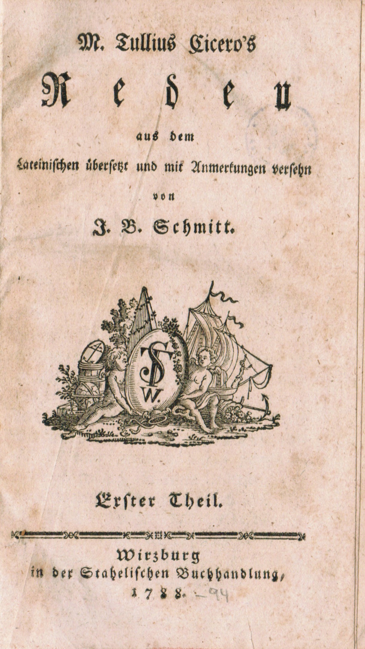 Cicero, M. Tullius. Reden aus dem Lateinischen übersetzt und mit Anmerkungen versehen v. J.B. Schmitt. 8 Theile in 4 Bdn. Wirzburg, Stahel 1788-94. Ca. 2250 S. Neuerer marmorierter Ppbd. Papierbedingt im Satzspiegel minimal gebräunt und nur teils minimal fleckig, kl. Bibl.-Stempel verso Titel.