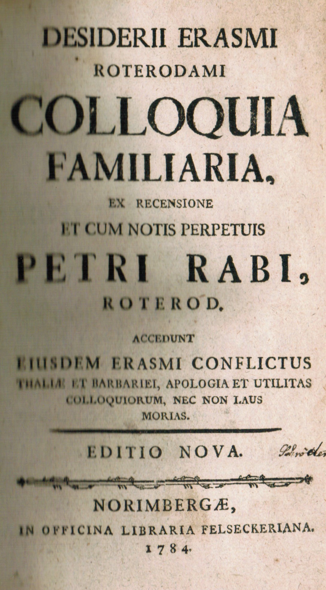 Erasmus Roterodamus, Desiderius. Colloquia familiaria, ex recensione et cum notis perpetuis Petri Rabi, Roterod. Accedunt eiusdem Erasmi conflictus thaliae et barbariei, apologia et ultilitas colloquiorum, nec non laus morias. Ed. nova. Und: MORIAS EGKOMION, declamatio in laudem stutitiae, quae ob sermonis elegantiam, argumenti amoenitatem et exemplarum inopiam rursus in lucem publicam prodire voluit aeque ac debuit. 2 Bde. (in 1). (lat.). Nürnberg, Libreria Felseckeriana 1784. 8 Bll., 872 S. + 12 Bll. (Index) u. 88 S. HLdr. d. Zt. m. verg. RSch., R.-Fileten u. kl. floralen Verg. (berieben, bestoßen, Kanten mit Abschabungen, ob. Kapital mit kl. (2 cm) Einriß u. geringer Abschabung, sowie hinteres Außengelenk mit kl. 0,6 x 0,4 cm) Fehlstelle). Van der Haeghen S. 43 (f. Colloquia), Die Morias dort nicht verzeichnet. – Papierbedingt nur wenige Seiten anfangs ganz minimal gebräunt u. nur teils ganz gering fleckig, nur S. 1 mit Tinten-Unterstreichungen, verso Vorderdeckel Name u. Nummer v. alter Hand u. Exlibris, Titel mit kl. Namens-Eintrag, verso Hinterdeckel u. Vorsatz mit Bleistift-″Kritzeleien“, Buchblock minimal angeplatzt, sonst aber in sehr gutem Zustand.