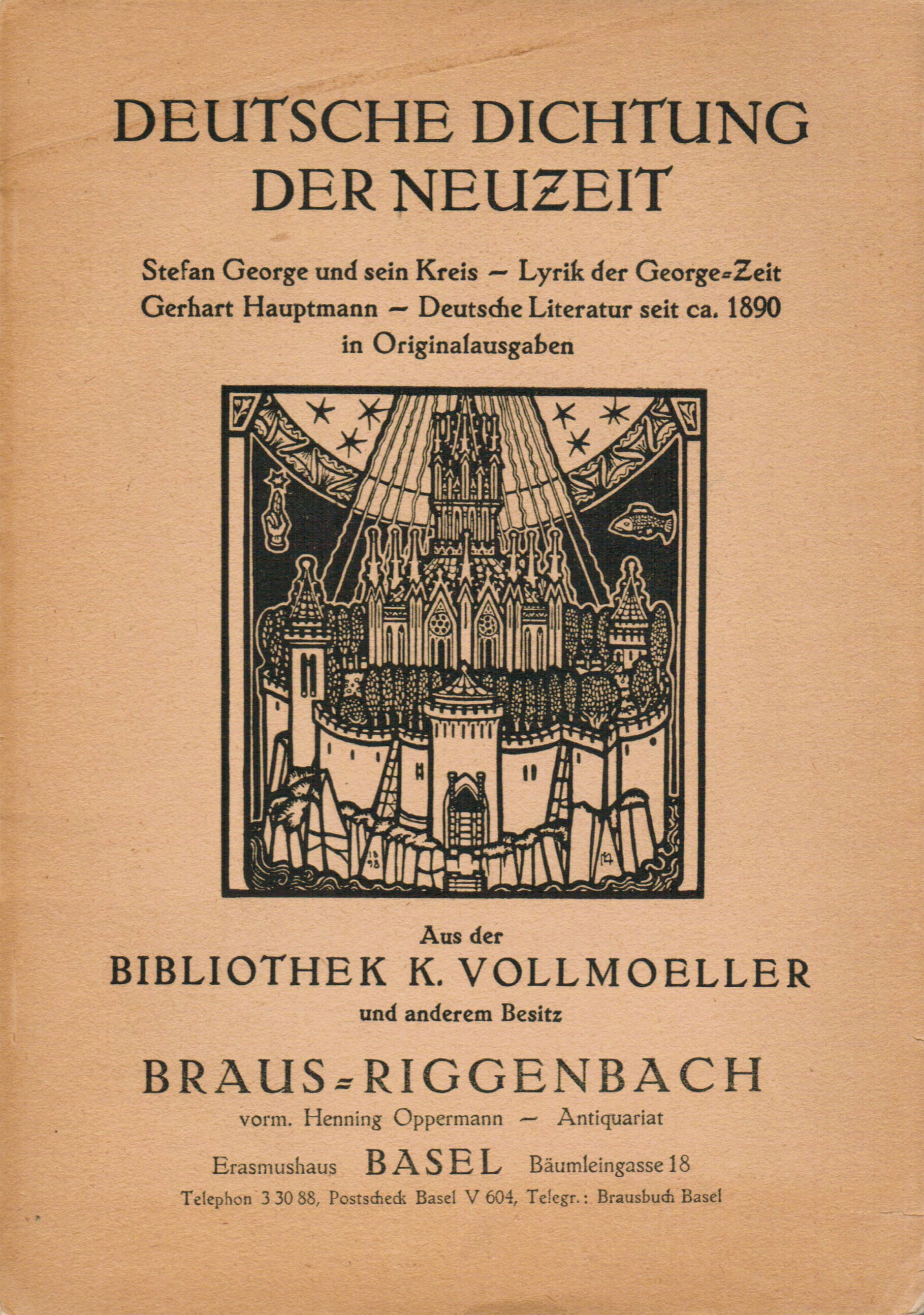 George, Stefan – Deutsche Dichtung der Neuzeit in Originalausgaben, größtenteils aus der Bibliothek K. Vollmoeller. – Antiquariatskatalog (ohne Preise). Basel, Braus-Riggenbach (Antiquariat) 1938. 79(1) S. OBrosch. (etwas gebräunt u. mit kl. Randläsuren u. Hinterdeckel mit kreisrunder Überklebung). Verkaufs-Katalog mit 1240 Nummern d. Antiquariat Braus-Riggenbach. – Enthält im 1. Teil eine Stefan George-Sammlung. Dichtungen des engeren und weiteren Kreises um Stefan George. Hugo von Hofmannsthal, Rainer Maria Rilke und andere Lyriker der Gegenwart (mit zahlr. Widmungsexemplaren). 2. Teil: Gerhard Hauptmann-Sammlung u. 3. Teil: Dichtung im Zeitalter des Naturalismus. Dramatische und erzählende Literatur von ca. 1890 bis heute. – Papierbedingt minimal gebräunt u. vordere Stehkante im w. Rand teils mit kl. Einrissen, S. 36 mit kl. runden Überklebung, sonst aber sauber. – Selten!
