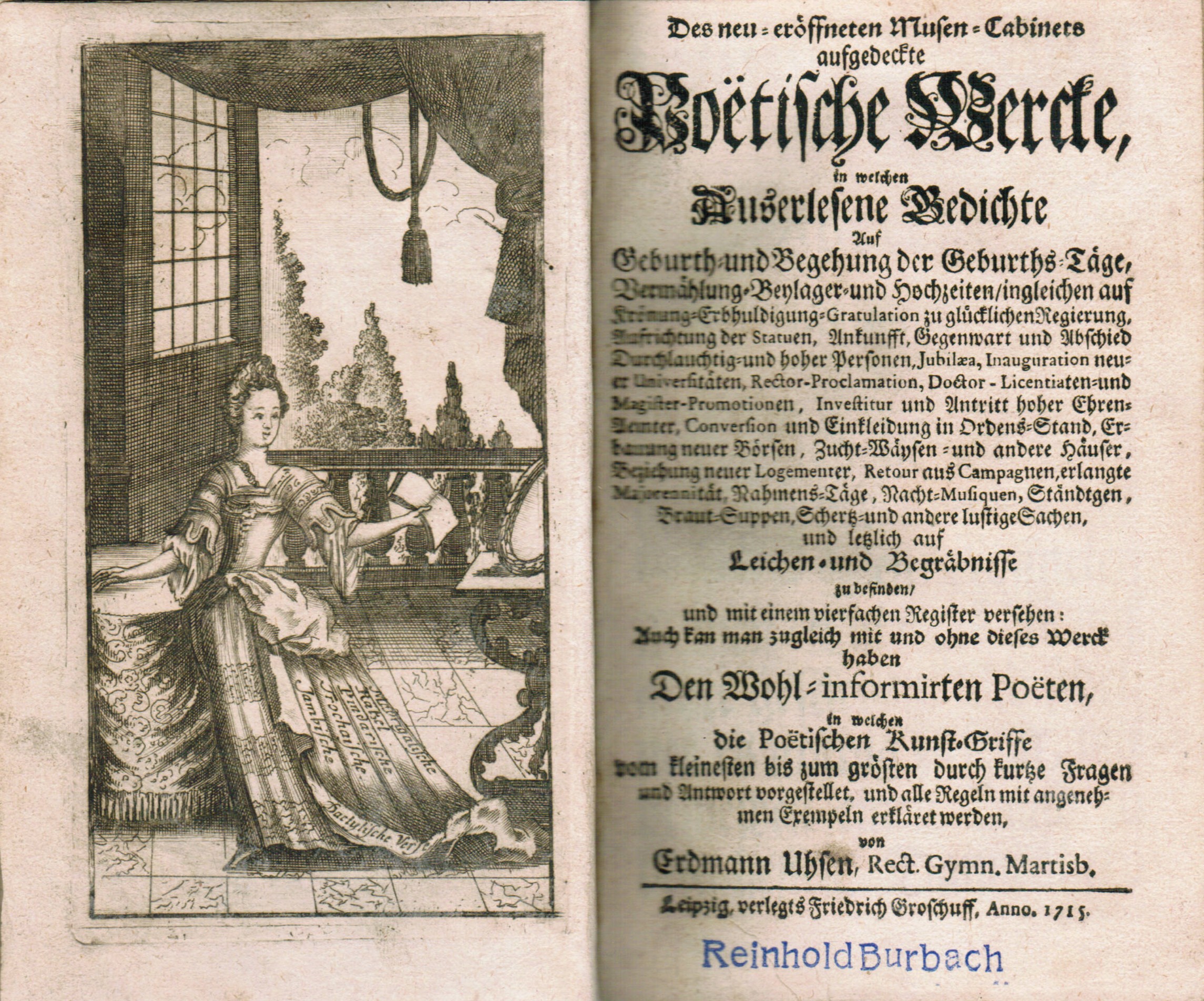 Uhse, Erdmann. Des neu-eröffneten Musen-Cabinets aufgedeckte Poetische Wercke, in welchen Auserlesene Gedichte Auf Geburth- und Begehung der Geburths-Täge, Vermählung-Beylager- und Hochzeiten / ingleichen auf Krönung-Erhuldigung-Gratulation … und letzlich auf Leichen- und Begräbnisse zu befinden, und mit einem vierfachen Register versehen … Mit 1 Frontispiz. Leipzig, Friedrich Groschuff 1715. Kl.-8°. Frontispiz, Titel.Bl., 3 Bll. (Vorrede), 1344 S., 19 Bll. (4 Register). Perg. d. Zt. mit handschriftl. R.-Titel (minimal berieben u. bestoßen, leicht angestaubt). ADB 39, 449f. Hayn/Got. V, 257. – Erstmals 1708 erschienen. – Uhse (1677-1730) war seit 1711 Rektor des Merseburger Domgymnasiums und Autor zahlreicher Nachschlagewerke. – Inhalt: Hochzeit-Gedichte. (S. 1-224). Leichen-Gedichte (S. 369-608). Vermischte Gedichte (S.737-976). Schertz-Gedichte (S.1105-1344). Die hier vorhandenen Seitensprünge sind laut Hayn/Got. original so. Der erste Teil der Hochzeitsgedichte ist unterteilt in 8 „Entrées“ mit jeweils einem eigenen Titelblatt, die jeweils Jahreszahlen von 1704 bis 1715 tragen. – Hayn/Got. versucht die Autoren der Gedichte, die lediglich mit Monogrammen versehen sind, aufzulösen; dabei werden als gesichert angegeben: Benjamin Neukirch, Erdmann Neumeister, Franz Conr. Romanus und Hans Anshelm von Ziegler und Kliphausen. – Papierbedingt nur teils leicht gebräunt, Name auf Vorsatz (v. alter Hand).